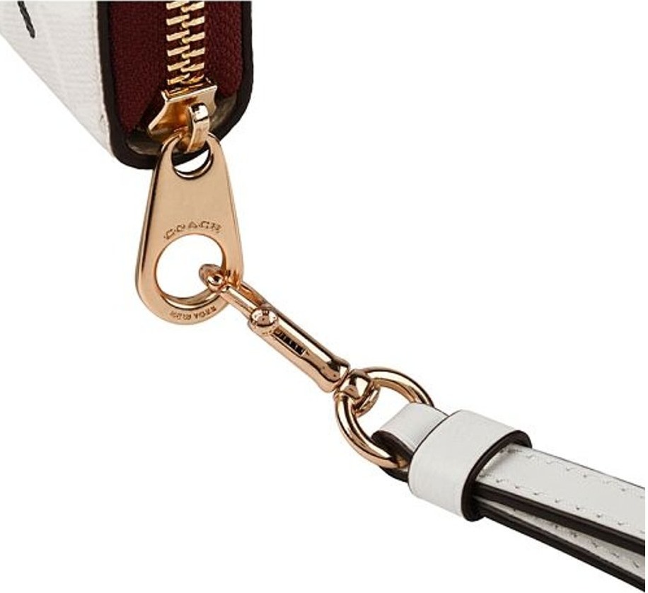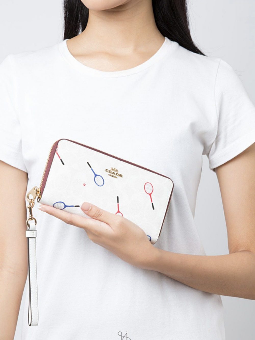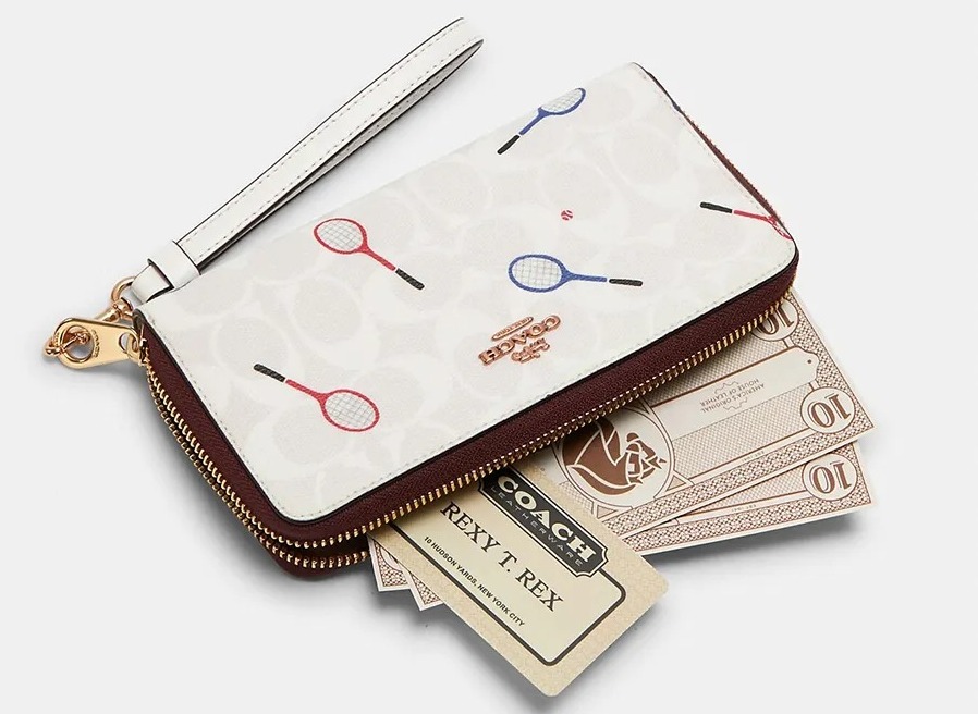 – Thiết kế ví gồm dây có thể đeo vào cổ tay tiện lợi. Điểm nhấn Logo Coach đặc trưng đặt tinh tế phía trước và được in hình vợt tennis trẻ trung. Ví đóng mở khóa zip gồm một khóa zip, 3 ngăn lớn và nhiều khe cắm thẻ tiện lợi. Đựng thoải mái các loại điện thoại trên thị trường.
